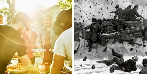 Not long after the mayor departed, calling the event peaceful, someone in the crowd threw a dynamite bomb after the large contingent of police sought to disperse the demonstrators. By the time police gunfire was over, eight officers were dead and dozens of police and civilians were injured.