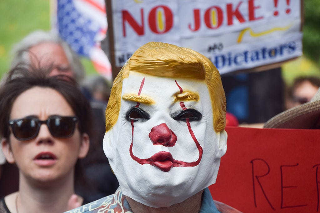 Is it that hard to see that the man who dresses up every day in orange pancake makeup and a contoured swirl of dyed hair to hide his balding head is not a reliable guide? That a man like this is not just a clown, he beclowns the whole country on the global stage?