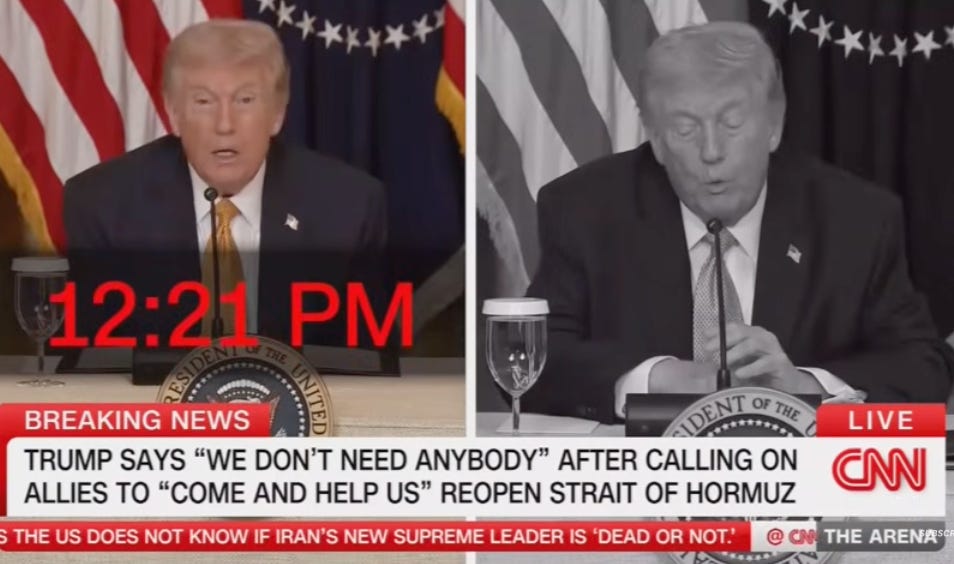 This is not just my opinion. I urge you to watch this short montage (one minute and 47 seconds) of Donald Trump’s mind-bending and deeply alarming contradictions showcased within a matter of minutes. It was assembled by CNN and shown by anchor Katie Hunt in an effort to make sense of his position on allies taking part in re-opening the Strait of Hormuz. His frustration over their sensible reluctance is obvious.